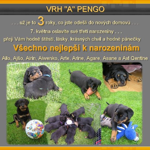 16.4.12 dnes mimina oslavila 7 týdnů. Váží od 5 do 6,5 kg. Ve středu je čeká důležitá návštěva, přijede je zkontrolovat poradkyně chovu P. Procházková. No a začnou se nám rozcházet ke svým novým páníčkům. Už ted z toho začínám být trochu smutná, ale páníčci už se jich nemohou dočkat. Na nové páníčky ještě čekají dva kluci.